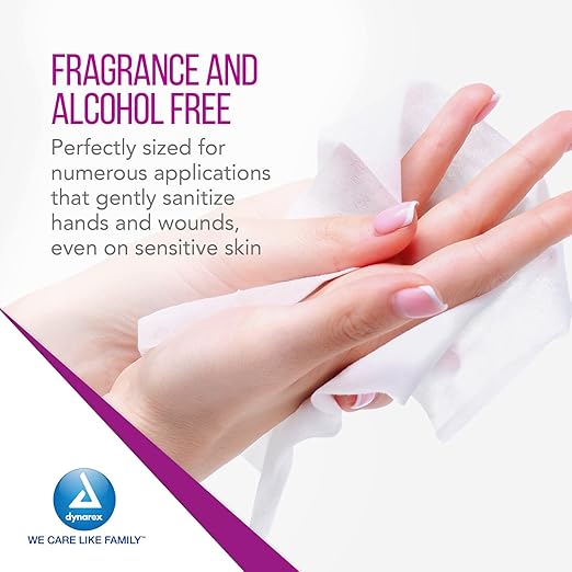 - FRAGRANCE- AND ALCOHOL-FREE: Dynarex BZK Cleansing Wipes are alcohol-free, unscented antiseptic wipes. These antiseptic cleansing wipes are perfectly sized for numerous applications that gently sanitize hands and wounds, even on sensitive skin.