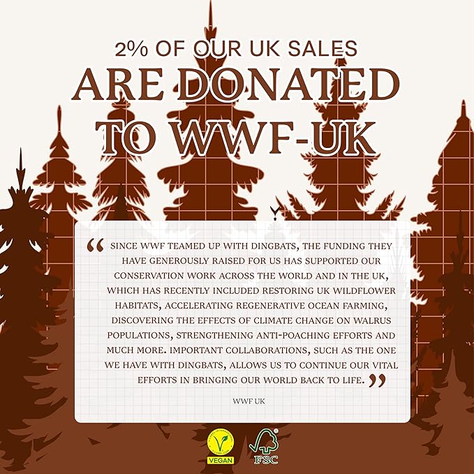 - SUSTAINABLY SOURCED, ENVIRONMENTALLY CONSCIOUS: Made from recyclable materials and FSC certified paper, our notebooks are Vegan Certified. Dingbats* Notebooks Ltd donates 2% of UK sales to WWF-UK, supporting environmental conservation.