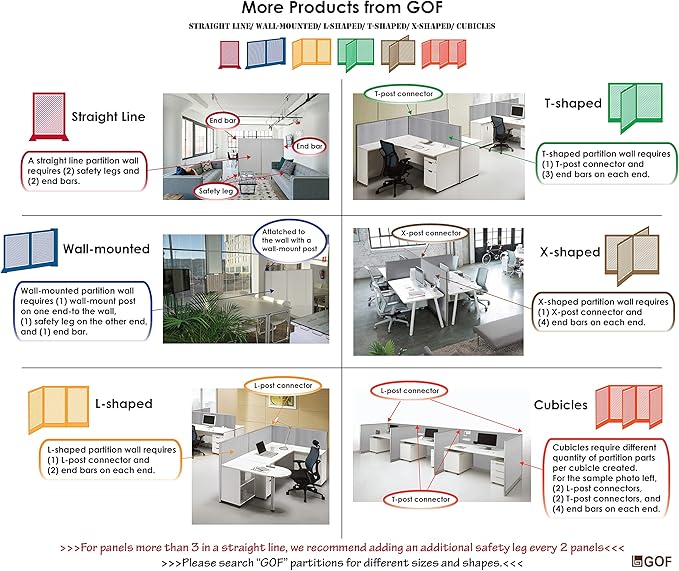 - Includes ONE SET of 30"D x 60"W x 60"H, L-Shaped Freestanding Partition, consisting of Three 30"w x 60"h Panel, 2 End Bars & 1 L-Post