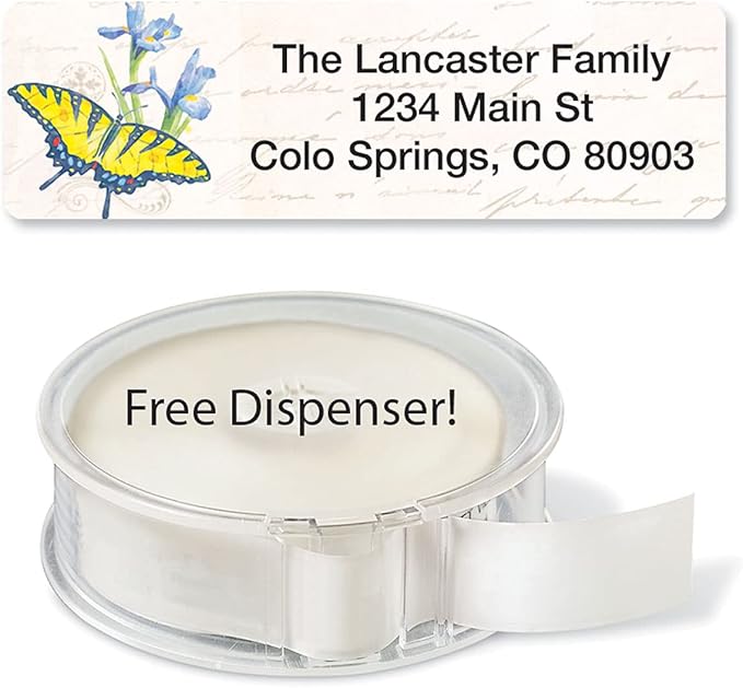 Butterflies & Flowers Rolled Personalized Return Address Mailing Labels with Dispenser, Set of 250, 5 Designs, Small ¾ x 2½ Inch Size, Custom Self-Adhesive Sticker Roll, by Colorful Images