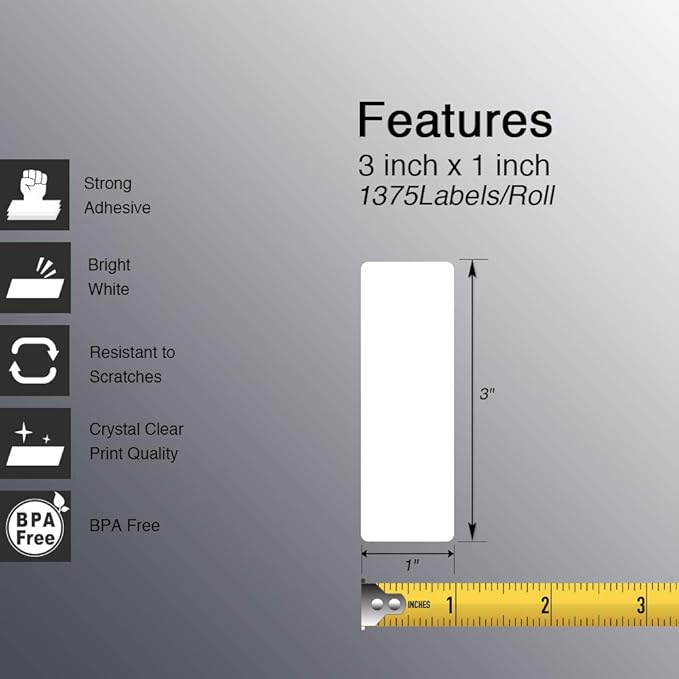 - [ Specifications ]: 3 in x 1 in (76 mm x 25 mm) (1375 Labels/Roll, 10 Rolls),Paper tube diameter:1"(25.4mm). No Ink Toner or Ribbons Needed! Save your money and effort.