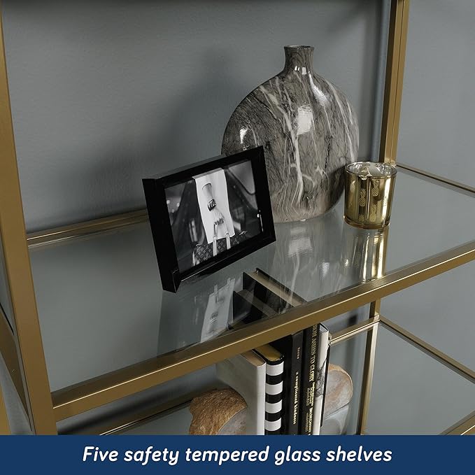 - STURDY MULTI-SHELF STORAGE: This Sauder bookcase boasts five open shelves with safety-tempered glass for versatile use in any room