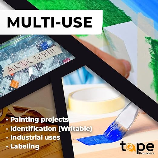 - GENERAL PURPOSE AND HIGH DEMAND APPLICATIONS - This High Quality Masking Tape works great for package sealing, taping off guitar fretboards, drafting table work, concealing wires on ceiling, holding the paper flat, taping off car headlights, labeling moving items and cans, closing boxes, taping boxes, holding art paper on drawing board.
