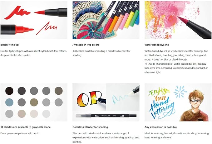 - Water-based pens ideal for coloring, fine art, illustrations, doodling, journaling, hand lettering and more.
