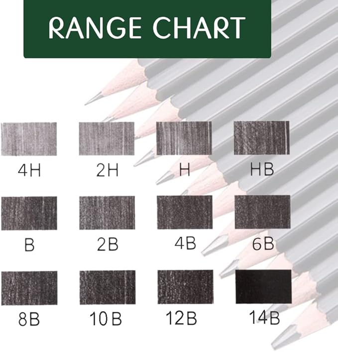 - Professional Level --- 12 sketching pencils, including 4H, 2H, H, HB, B, 2B, 4B, 6B, 8B, 10B, 12B, 14B soft, medium, and difficult. Leads of different types are very suitable for gray and black shades.