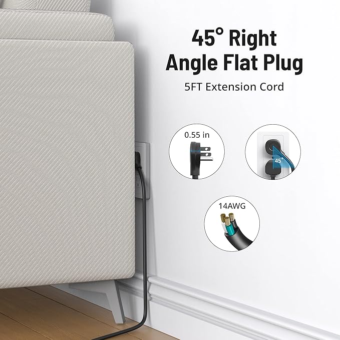 - Flat Plug Power Strip: Low-profile flat plug fits easily in tight spaces, such as behind a sofa. 45° angled flat plug eliminates awkward cords from cluttering indoor décor and doesn’t block the bottom receptacle. the 5-foot extension cord is made of 14awg pure copper, is heavy-duty, and has a better current carrying capacity (15A)