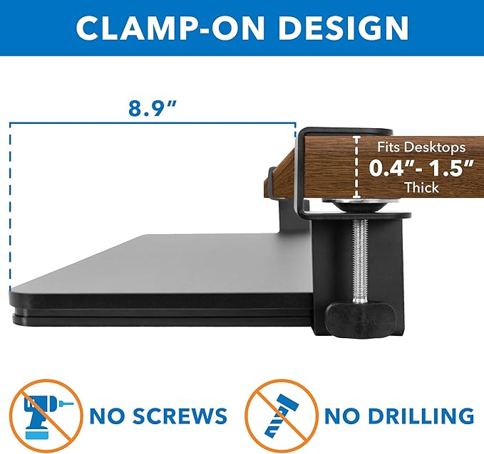 - Simple No-Drill Installation: Includes detailed instructions, mounting hardware, and adjustable clamps for a hassle-free setup. Fits desks with thicknesses up to 1.5" and requires a minimum width of 31” for proper installation.