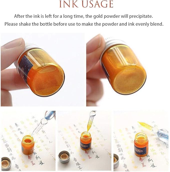 - 14 VIBRANT COLORS INK: 14x7ml colors of ink contain gold powder enable your creation more incredible. If you are looking for an ink which is shimmering, highly reflective colors that are lightfast, archival, and permanent, works for illustration, calligraphy pens, dip pens, this ink set would be your best choice. Shake the ink bottle well before use.
