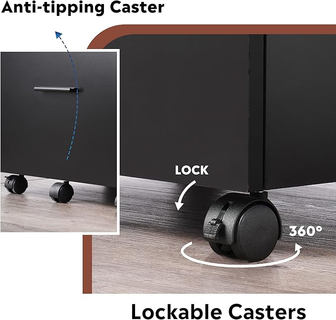 - DURABLE CASTERS: 5 rolling casters which can move smoothly on both wood floor and carpet. With front 2 lockable breaking wheels, makes office supply rested on top, like printer. Middle caster prevents tipping over when all drawers open at the same time.