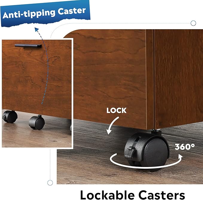 - DURABLE CASTERS: 5 rolling casters which can move smoothly on both wooden floor and carpet. With front 2 lockable braking wheels, makes office supply rested on top, like printer. Middle casters prevent tipping over when all drawers open at the same time.