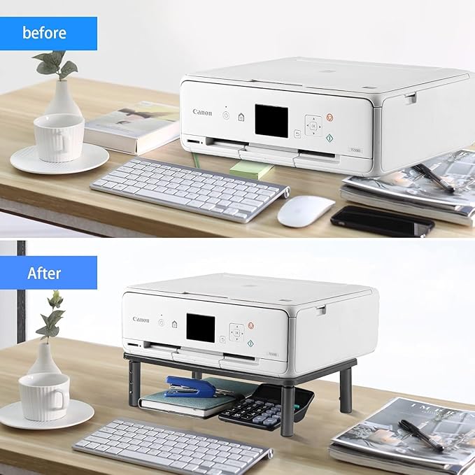 - Sturdy Material: Large 37cmx 23.5cm durable metal shelf fit most flat screen display, laptop and printer, maximum support weight up to 20kg. Anti-skid rubber pads prevent slipping or damage to your work surface. Sleek modern black design complements any desk while adding extra space underneath the stand for storage.