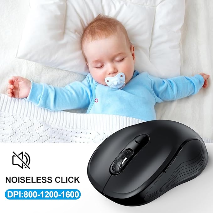 - ▶[3 DPI LEVELS & 6 BUTTONS] 3 Adjustable DPI Settings, 800, 1200 and 1600. This computer mouse gives precision tracking on just about any surface, with a DPI button helping to change the sensitivity on the fly. Extra 2 Side Buttons ideal for both work and gaming. Plug and play directly with A RECEIVER STORED IN THE BATTERY COMPARTMENT, no any driver needed!