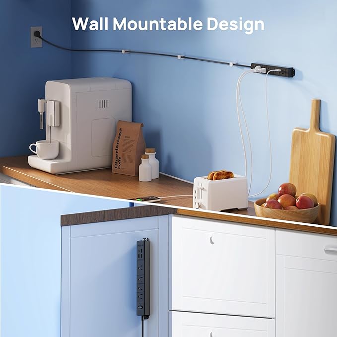- Ultra Flat Plug & Wall Mountable: The low-profile right angled flat plug design is great for stashing under or behind furniture. Four screw-mounting tabs allow this wall mount flat plug power strip to be securely installed on workbenches, behind the tv, garage, bedside, under counters/desks/cabinets, and dressers