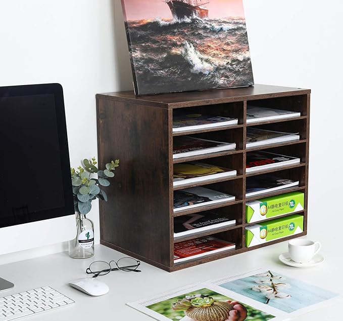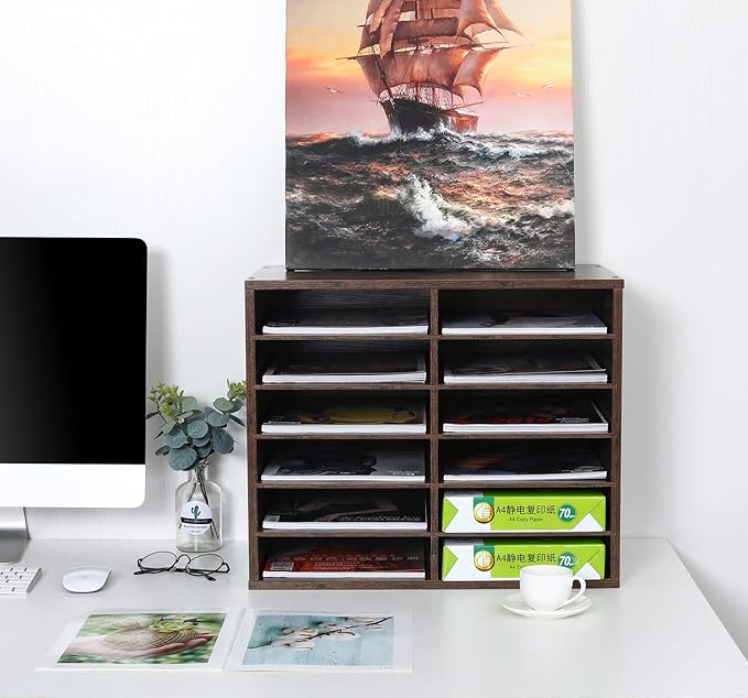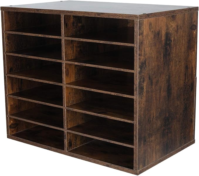 - 12-Compartment Mail Sorter Organizer: Hold 500+ A4 paper sheets in each compartment in this mail organizer. With 12 compartments (12 x 9 x 2.1 inch eash slots), store comics, magazines, and travel brochures effortlessly. EPA-certified particleboard ensures long-term durability for office/classroom use.