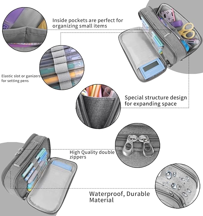 - Multi-storage – Two double-zipper openings with 10 mesh pockets, 7 pens elastic loops, 2 inner zipper pockets, will definitely keep all stuff neat tidy; can hold 60-80 pens or similar items