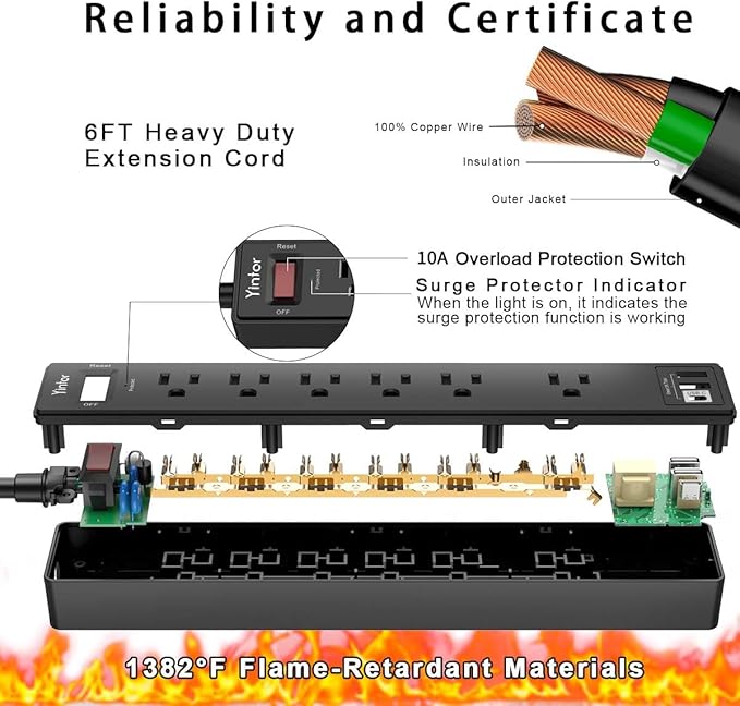6Ft Power Strip Surge Protector - Yintar Extension Cord with 6 AC Outlets and 3 USB Ports for for Home, Office, Dorm Essentials, 1680 Joules, ETL Listed, (Black)