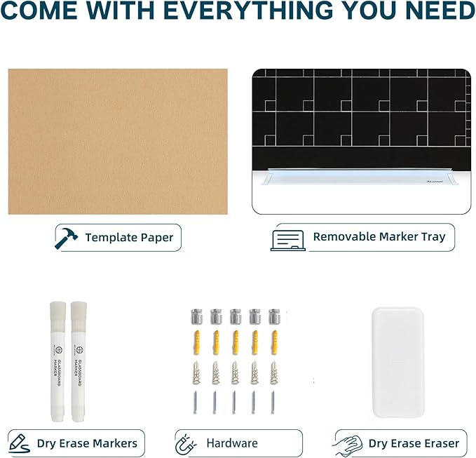 - 【Accessories Included】 The package includes 1 dry erase marker, 4 magnets and 1 glass whiteboard eraser, 1 removable aluminium marker tray, and 1 template paper for mounting. One-stop shopping. It's a great gift idea for your workmate, boss or spouse which can enhance the office/ house wall.