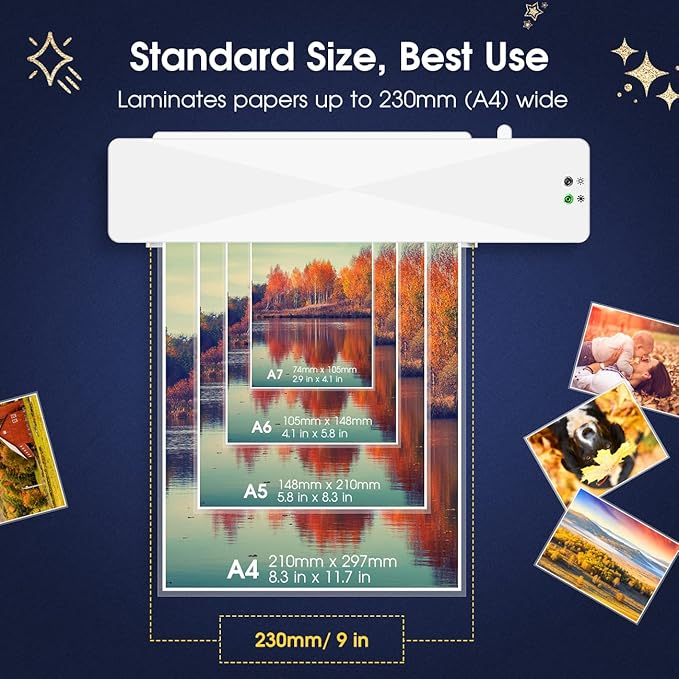 - ๐Ultra Portability: This laminator features 230mm inlet (9 in, A4 size), perfect to fit any desktop. This great set includes 1 laminator &1 user manual to help you get started quickly.