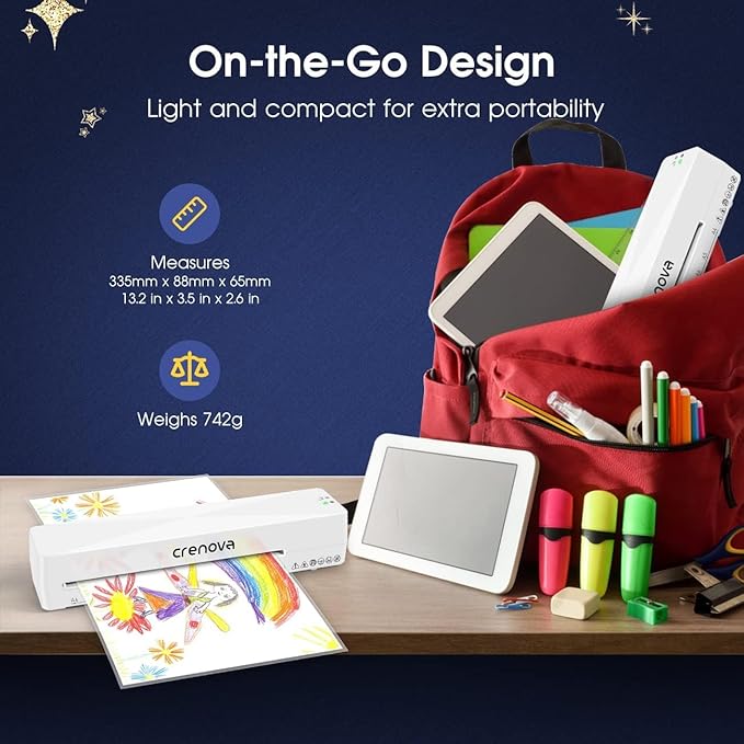 - ๐Fast Warm-up, Vivid Color:Crenove laminating machine only takes 1-2 minutes to preheat. It compatible with 10pcs 2 x 80-125mic A6 laminating pouches. Crenova preserves your precious photos' colors, keeping memories alive.