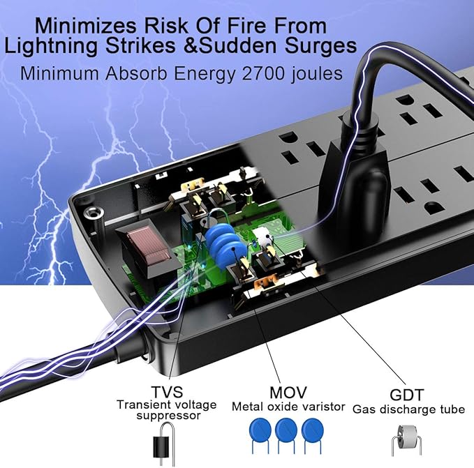 - 【12 AC Surge Protector Outlets】- The 3 level complementary Surge Protector Circuit which composed of TVS (transient voltage suppressor), MOV (metal oxide varistor), GDT (gas discharge tube), with minimum 2700 Joules energy absorbing capacity, could protect your devices much more quickly and reliably than other brand’s 1 level MOV Surge Protection Circuits.