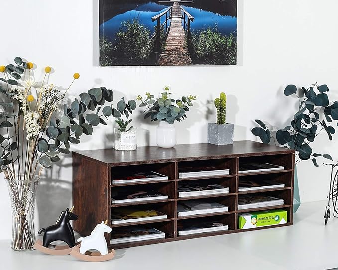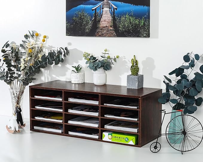 PAG Mail Sorter, Wood Countertop Literature Organizer, Student Mailbox for Classroom, Desktop Bill Paper Organizer for Office Home School, 12 Compartments, Brown