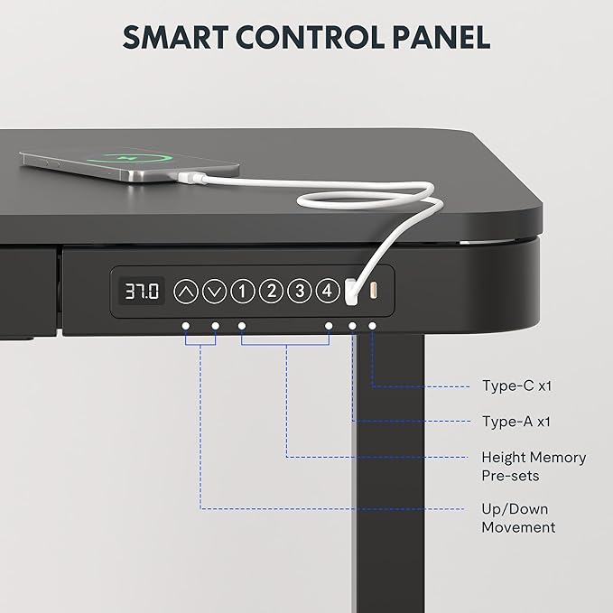 - Embedded Multiple Functions: Easily save multiple with four programmable height presets. Charge up to two devices with integrated USB ports (Type-C output: 45W fast charging, suitable for laptop charging); Type-A output: maximum of 27W fast charging; When used simultaneously with two ports, the output power is 5V 1.5A per port, 7.5W) without mess & hassle. (Note: USB ports may pause charging while adjusting desk height.)