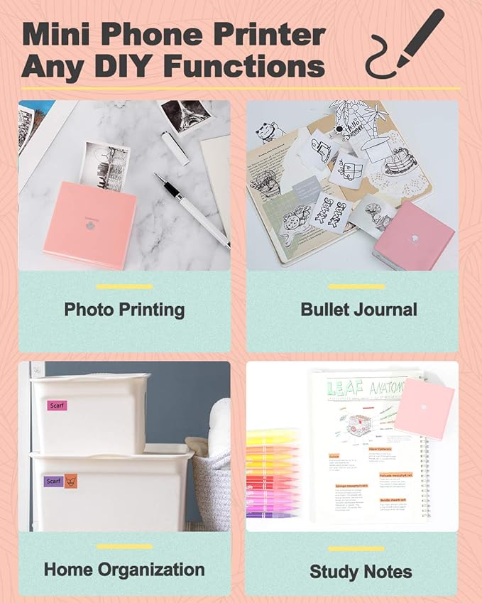 - Multi-Purpose Mini Printer- Phomemo M02 mini sticker printer is suitable for company business, work planner, office assistant, memo, study notes, shopping list, receipts, bookmarks, greeting cards, alphabet learning, coloring and so on. You can use it for DIY, study, fun, labels and create more