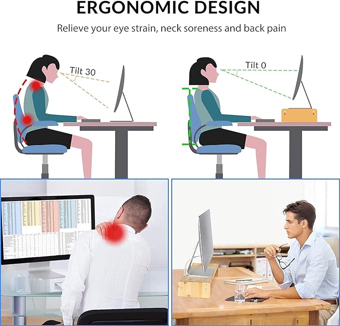 - ERGOMOMIC MONITOR RISER: Keep your monitor at comfortable eye level, providing you with a better visual experience. It can make you develop a good sitting position that could relieve your eye strain and your neck and back pain, enhancing work efficiency.
