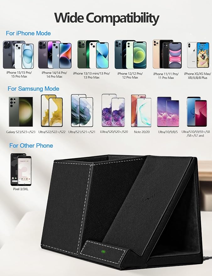 - ✎✎✎ Universal Compatibility of Wireless Charger: 7.5W fast charging for iPhone 16/15/14/14 Plus/14 Pro/14 Pro Max/13/13 Pro/13 Mini/13 Pro Max/12/SE 2020/11/XS/XR/X/8; 10W fast charging compatible for Samsung galaxy S24/S23 Ultra /S23/ S23+/S22 Ultra / S22 / S22+ / S21 Ultra /S21+ / S21/ S20 Ultra / S20/Note 10/S10/S10E and So on; (Note: Adapter is NOT Included)