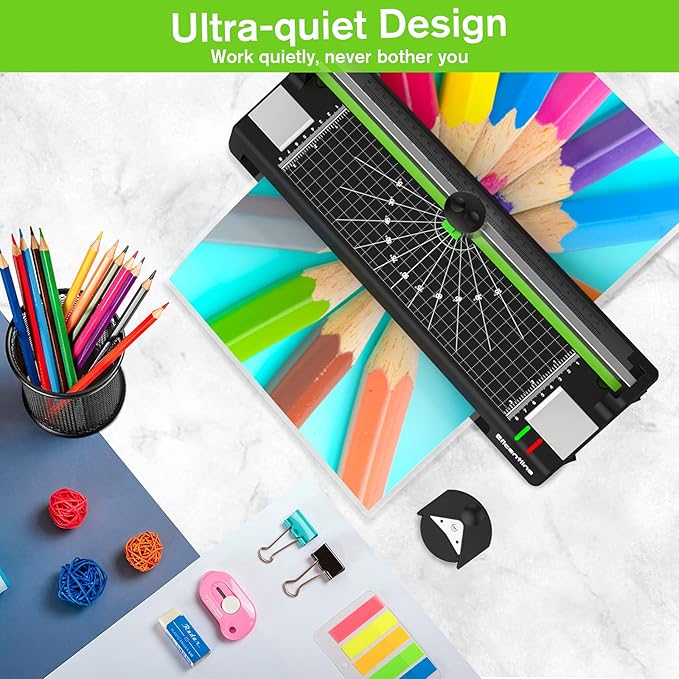 - ✔【5 In 1 LAMINATOR MACHINE AND NO NOISE】: Including a corner rounder and three-different-patterns paper trimmer and 50 pouches(25 for A4, 25 for A6)), this is a newly updated laminator machine with a speed of 250mm/min for the laminating system. Besides owning its double roller design ensures a smoother and faster lamination, so there will be low noise when laminating the paper, which create an quieter environment for us.