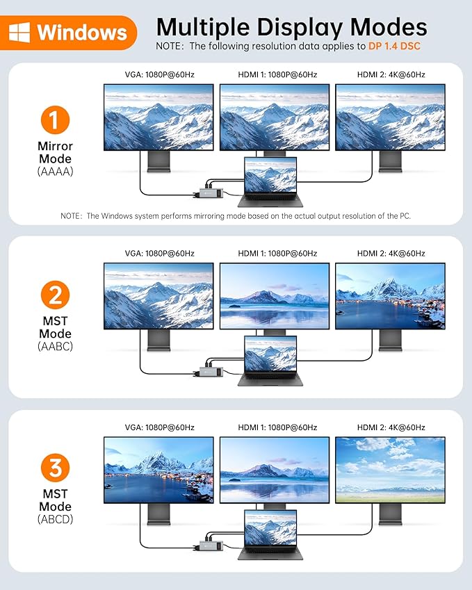 - Docking Station Dual Monitor: Dell docking station will help you easily achieve dual-monitor and triple-monitor display, making your work/life more efficient;( Triple Display 2 HDMI 4KVGA 1080P) ★Please Note Before Purchase: Only the built-in usb c port of your laptop is the fully functional port, you can use the dual/triple monitor function if you are not sure, please send the laptop model and we will help you to check if this docking station is compatible for your device