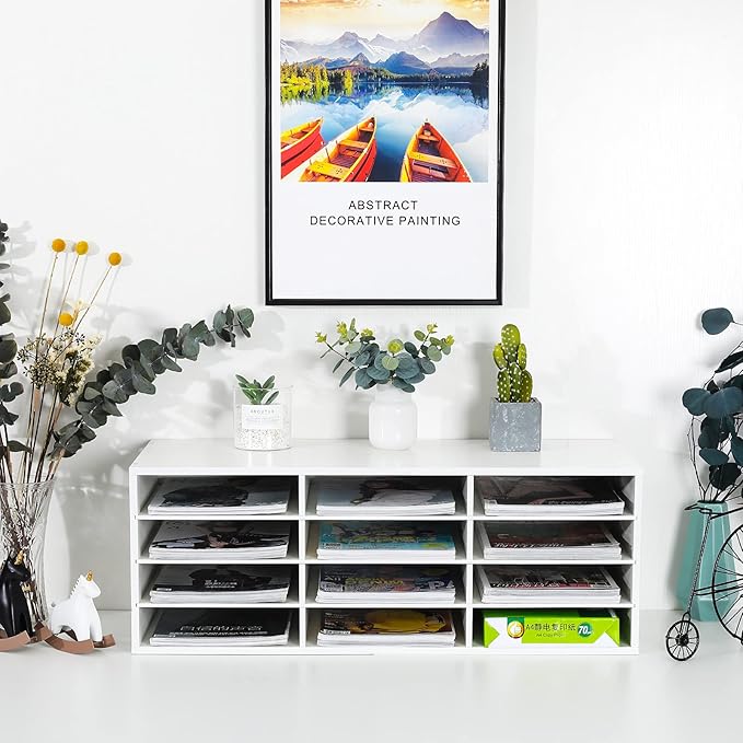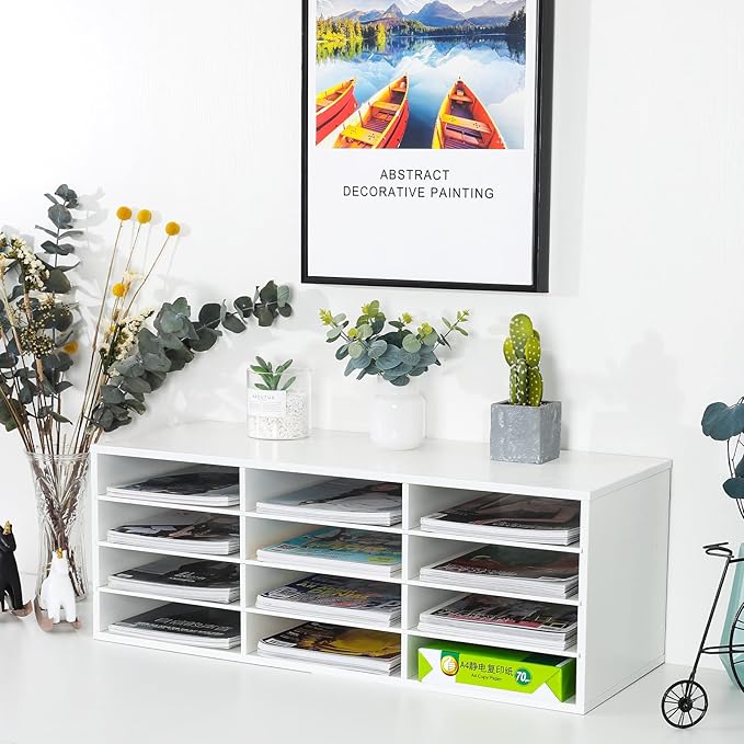 PAG Mail Sorter, Wood Countertop Literature Organizer, Student Mailbox for Classroom, Desktop Bill Paper Organizer for Office Home School, 12 Compartments, White