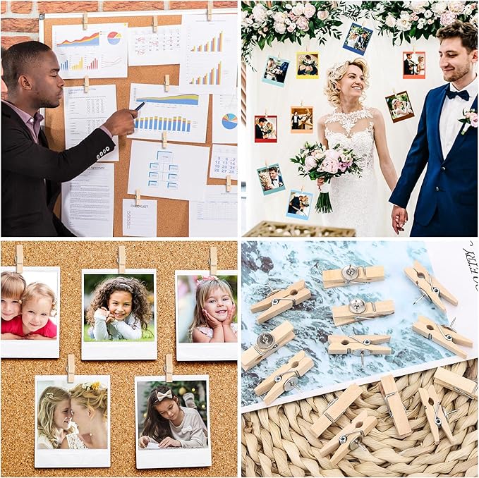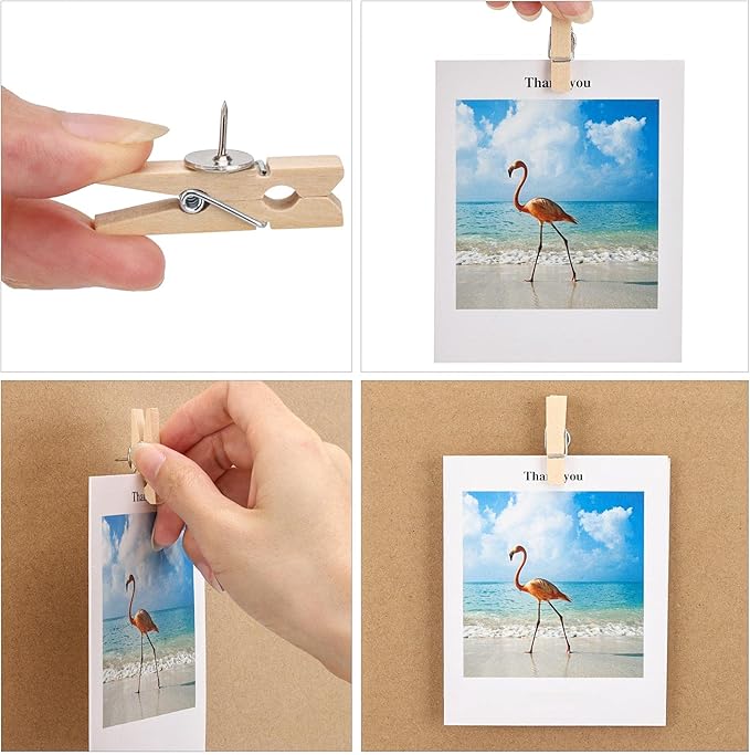 - Wooden clips combine the advantages of clips and pins to enable damage-free display of photos, pictures and notes on a corkboard or bulletin board. And you don't have to remove and insert them from the corkboard as often