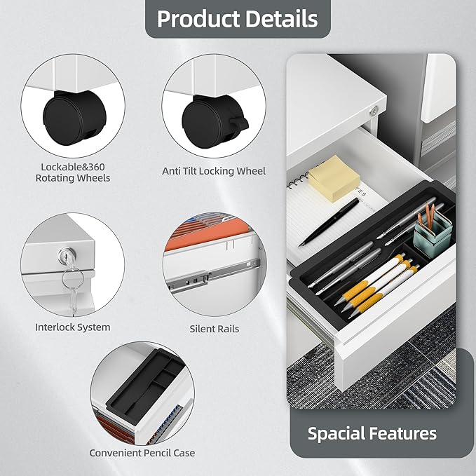 - 【Interlock System】This file cabinet with 3 drawers fits under most desks, add security to your home or office and is equipped with two keys. It can help you keep your valuables and documents safe.