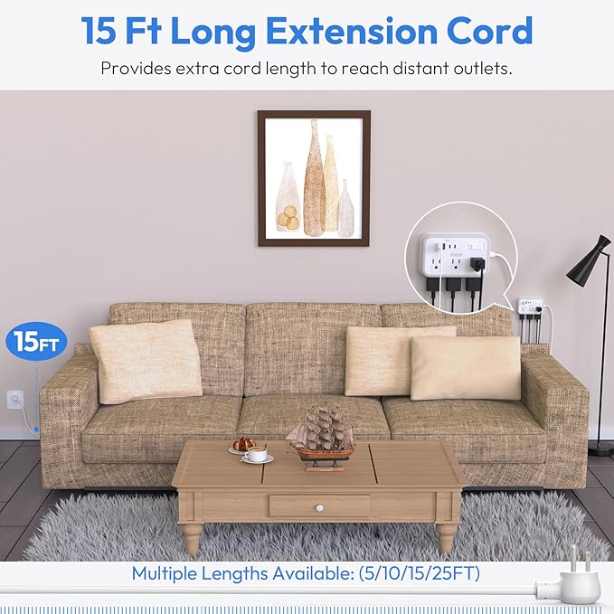 - 【 Extra Long Extension Cord with Flat Plug 】This flat plug extension cord 15 feet gives you the flexibility to reach distant outlets and hard-to-reach places. A perfect solution for when power outlets are not conveniently located nearby. 45°angled plug doesn’t block the bottom receptacle. The flat plug features a low profile fits easily in tight spaces like behind furniture, bookshelves, desks.