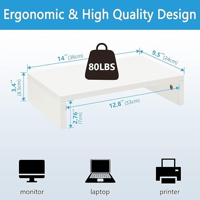 TEAMIX 14.2 inch White Monitor Stand Riser, Wood Monitor Riser with Storage for Desk Small Monitor Stand TV/Screen/PC/Laptop Riser Computer Stand Desktop Shelf (White-14.2 inch)