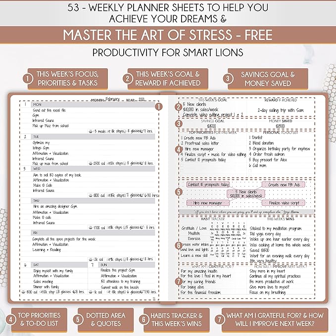 - LIFE PLANNER - A5 Size, 212 pages of life transformation, 53 weekly, 12 monthly planning overviews & reflection, 22 dotted journal pages, habit trackers, mind maps, morning & evening routines, inner pockets, pen holder & gift box