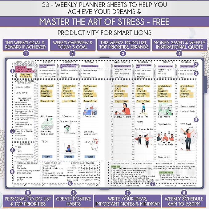 - SELF CARE PLANNER - This premium planner is undated and combines daily, weekly, and monthly planning features along with productivity, goal setting, business organization, to-do lists, notebook functionality, and gratitude journaling all in one. It includes goal-setting guidance that teaches you how to apply the law of attraction and vibration principles to become the best possible version of yourself on a mental, physical, and interpersonal level, thereby increasing productivity and happiness.