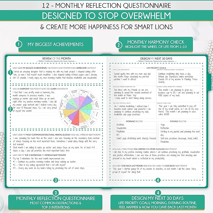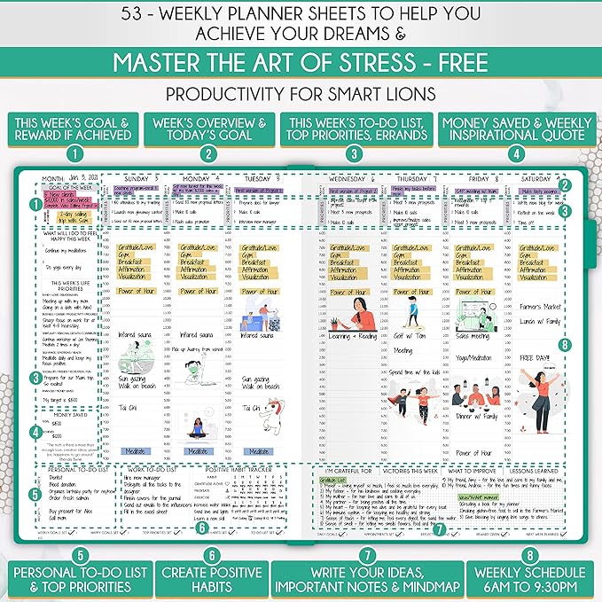 - HABIT TRACKER JOURNAL - Reduce overwhelm, tension, and procrastination by using a groundbreaking 8-step technique to reclaim your life's balance, clarity, and serenity while achieving your goals. Seize the potential of each day. This personal organizer dedicates a separate page for every day, featuring sections for scheduling, goal setting, prioritization, task lists, reflection, and ample space for notes. With its expansive large format, you possess all the room necessary for comprehensive planning.
