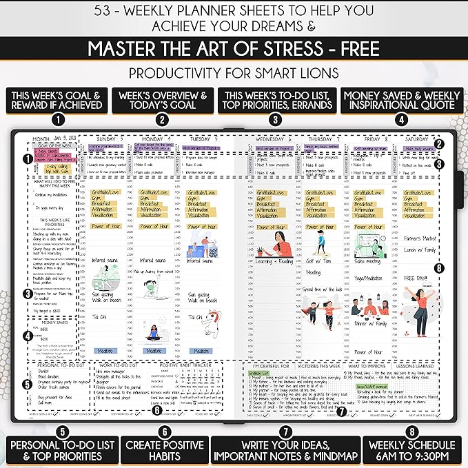 - LIFE PLANNER - A4 Size (8.3 x 11.7 inches), 256 pages of life transformation, 53 weekly, 12 monthly planning overviews & reflection, 31 dotted journal pages, habit trackers, mind maps, morning & evening routines, inner pockets, pen holder & gift box