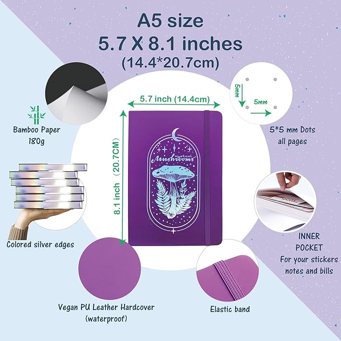 - ★ SIZE: 5.7 X 8.2 inch( A5 Medium/143*205MM for inner pages size); 160 Pages (80 Sheets); Page Layout: Dotted Grid 5*5 MM.