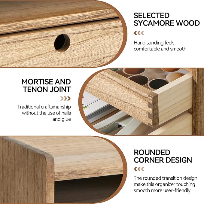 - [EXQUISITE WORKMANSHIP]: The desk organizer is made of selected real wood, the texture is clear and natural, exquisite workmanship,hand polishing.