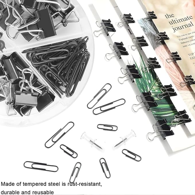 - Exquisite Quality - Elevate your workspace with premium steel construction, every paper clip, binder clip, and push tack features lustrous metal plating for durability, dust resistance, and reusability