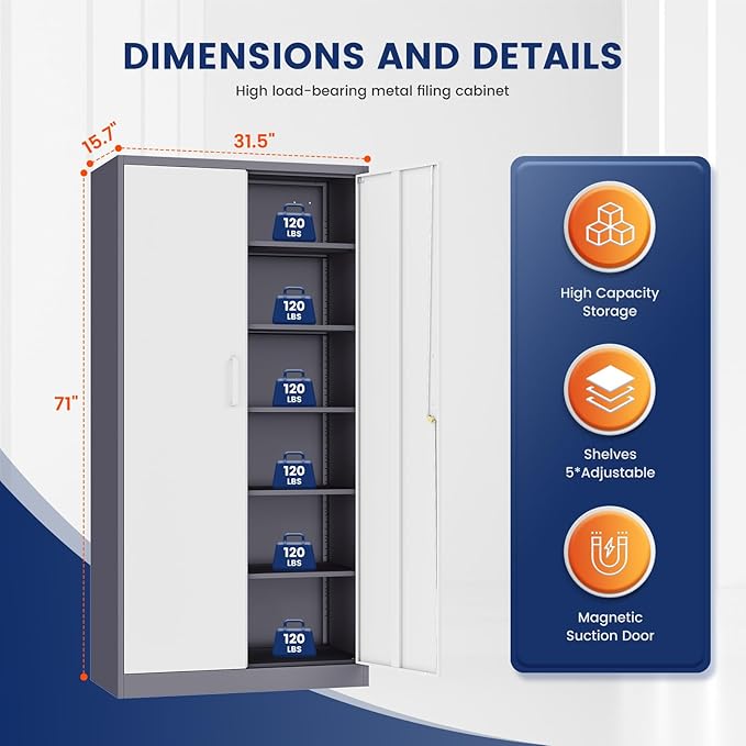 - 『WEIGHT CAPACITY』: Sturdy and reliable - each of the 5 shelves in this tall cabinet can hold up to 180lbs, With a heavy duty metal frame, these shelves will stabilize their contents and protect them.Whether you want to store office files, garage tools, or other large and heavy items, it's no problem.