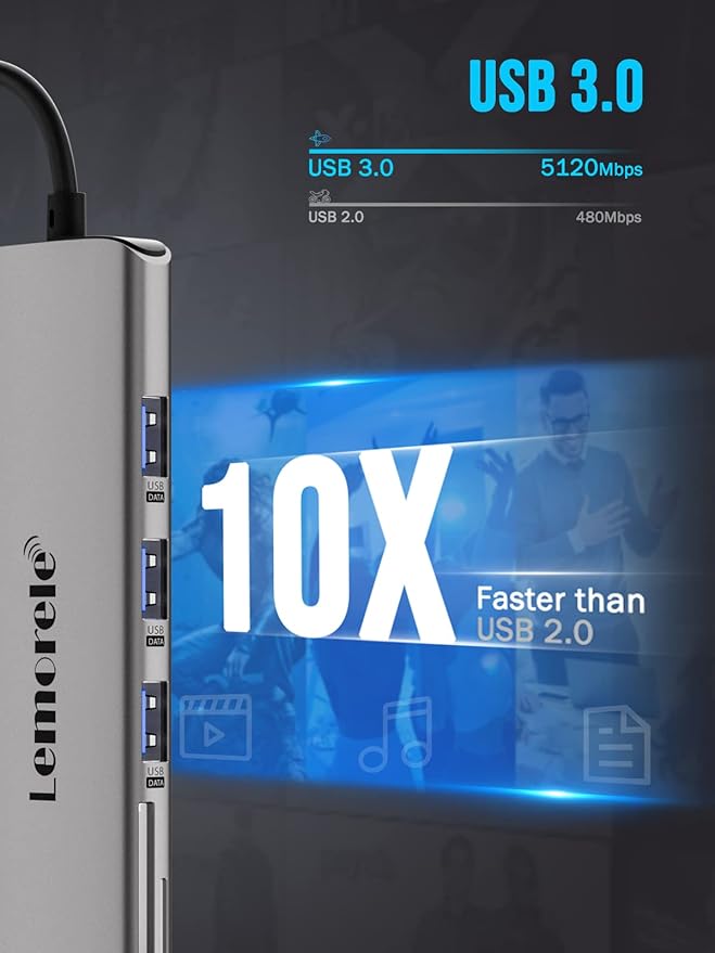 - 【4 x USB Ports for Full Connection】 Lemorele USB C Dongle offers 1 x USB 3.0 port( super speed with data transfer up to 5Gbps), 1 x USB C 2.0 for ports fast transmission, 2 x USB 2.0 ports for connecting the USB peripherals such as flash drive, hard drive, keyboard, mouse, printer and more.