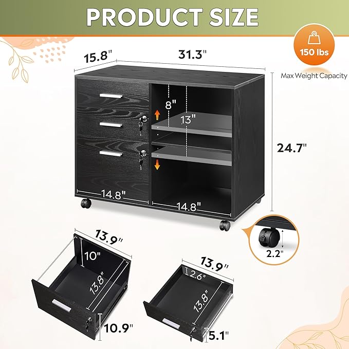 DEVAISE 3-Drawer Wood File Cabinet with Lock, Mobile Lateral Filing Cabinet, Printer Stand with Open Storage Shelves for Home Office, Black