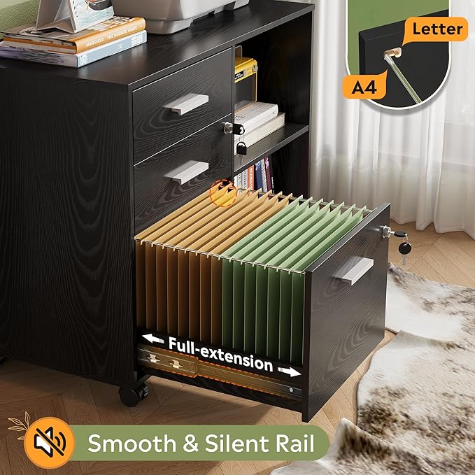 - Ample Storage Space: Equipped with 3 spacious drawers and 2 open shelves, the top 2 small drawers provide ample storage for smaller items. The bottom drawer accommodates hanging files in Letter and A4 sizes, and it fully extends for easy file access.