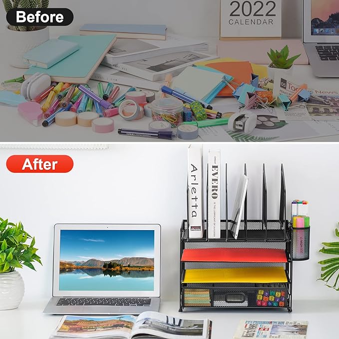 - 【Multifunctional Desk organizer】Our upgrade desktop file organizer has vertical and horizontal storage space – 4 sliding trays +5 vertical sorters +3 compartments drawer+ additional 2 pen holders . Upright section has five 2" Compartments for magazines, bill, file, book. Three types of use to meet your various office needs!!