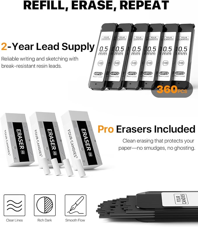 - Super Value Set: This set contains 6pcs 0.5mm drafting pencils and 360pcs HB Lead Refills, 3pcs 4B erasers, 9pcs eraser refills and a plastic storage case; This mechanical pencil set is great for writing, drawing, and sketching