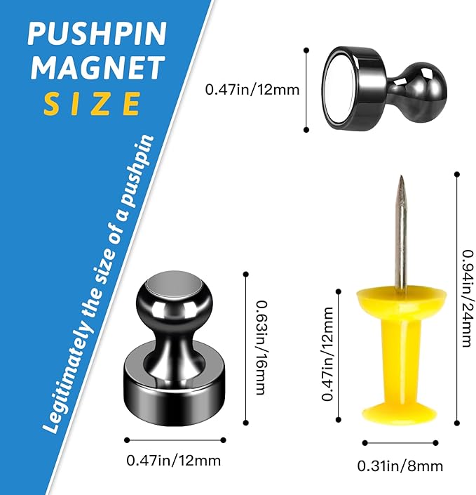 - 【Premium Material】Push pin magnets will never let you down! magnets are made of neodymium material, 3-layer (Nickel + Copper + Nickel) Triple-coated, with a smooth edge. These metal magnets are tiny too, the size of each magnet is 0.47in/12mm x 0.62in/16mm, so they won't cover up the exact things you want to display. They are strong and are suitable for any magnetic surface but are not suitable for thick glass magnetic boards, note that stainless steel is NOT magnetic.